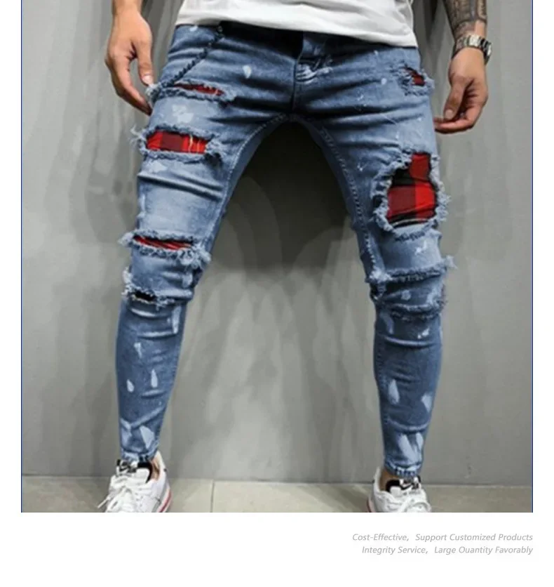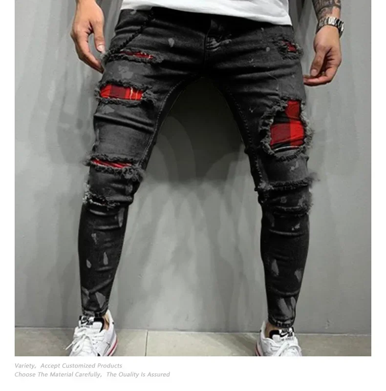 Pantalones vaqueros de tubo con agujeros desgastados para hombre, ropa de calle, vaqueros de retazos, cintura media, corte ajustado, lavados, hasta el tobillo