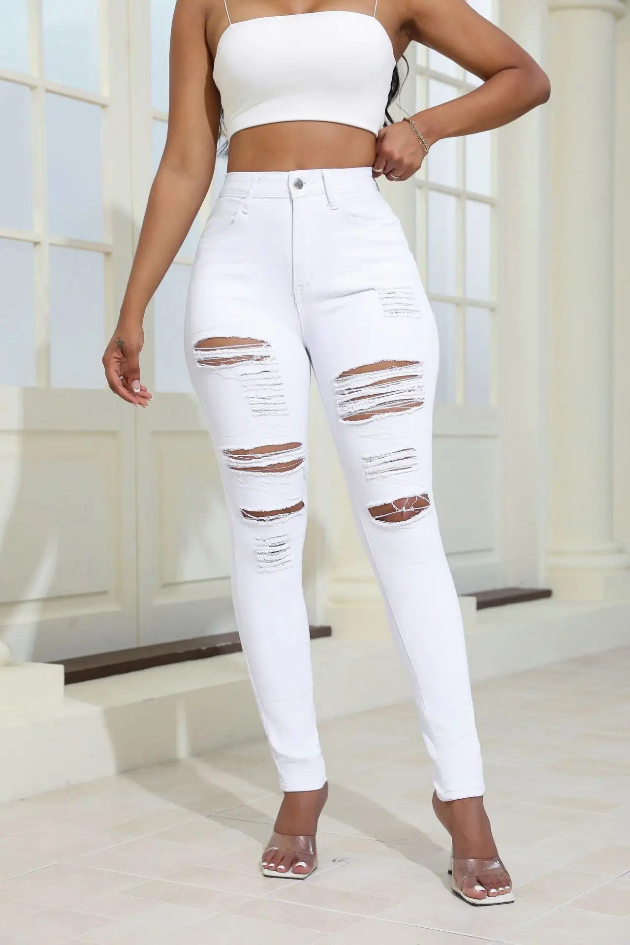 Pantalones vaqueros sexys de cintura alta con agujeros, elásticos, rotos, blancos y negros, para mujer. Vaqueros rotos para mujer.
