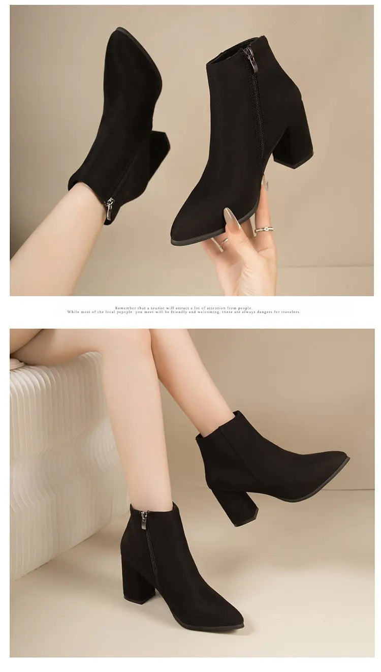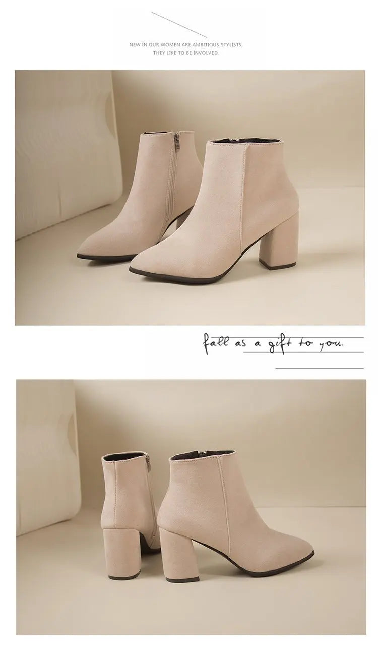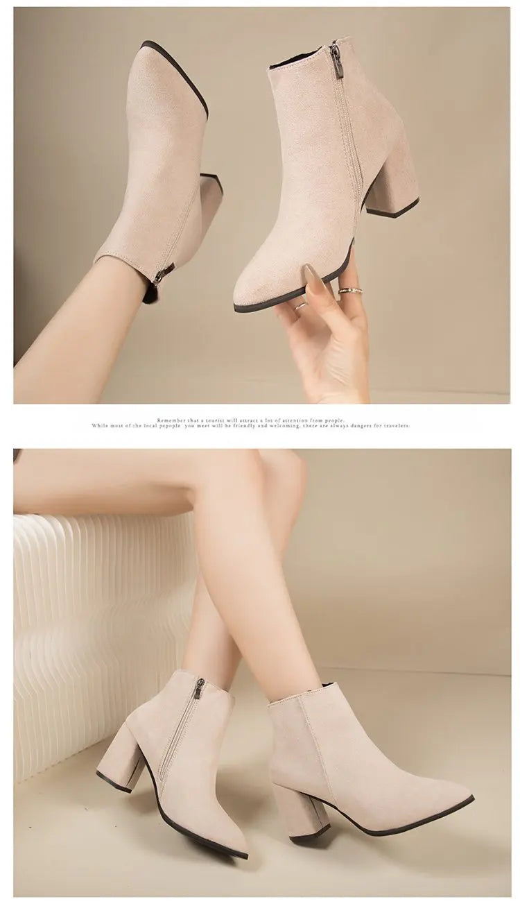 Nuevas botas sencillas de tacón cuadrado con cremallera lateral y tacón alto de ante puntiagudo para mujer.