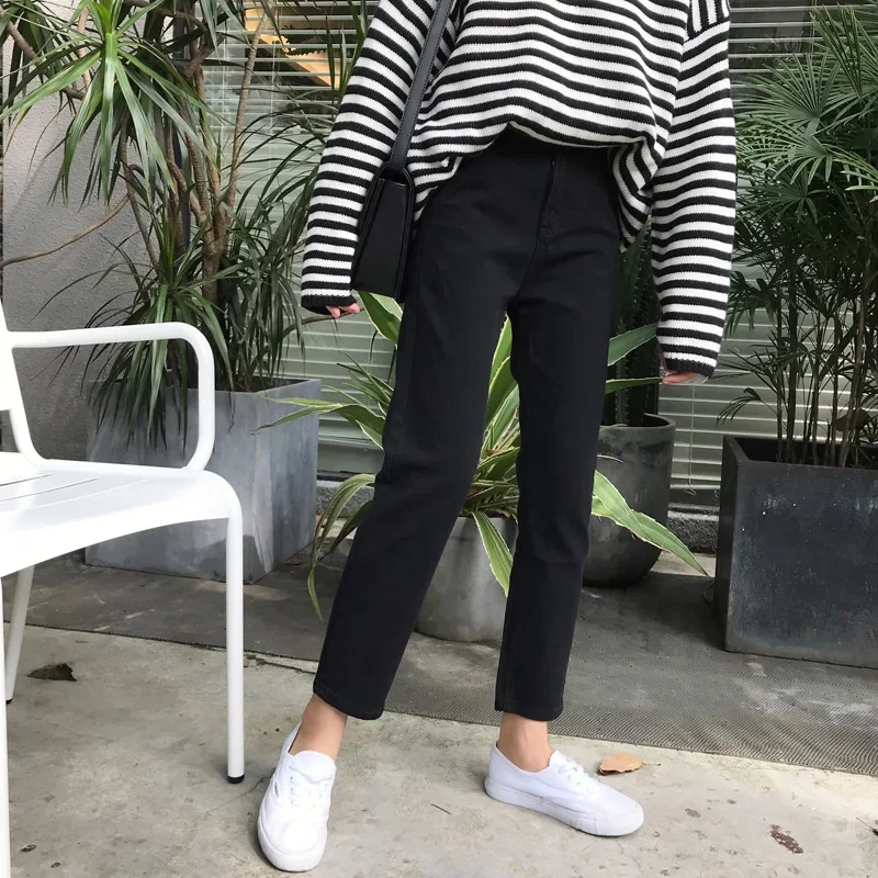 Pantalones vaqueros rectos de cintura alta para mujer, holgados, informales, de corte pequeño, color negro, para primavera y otoño.