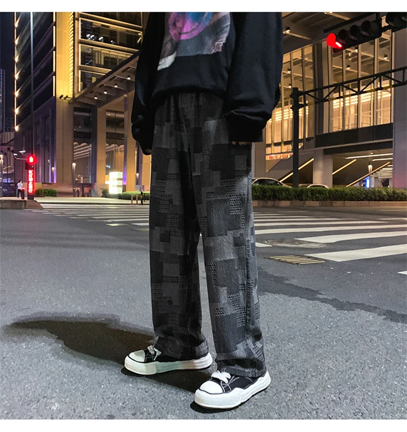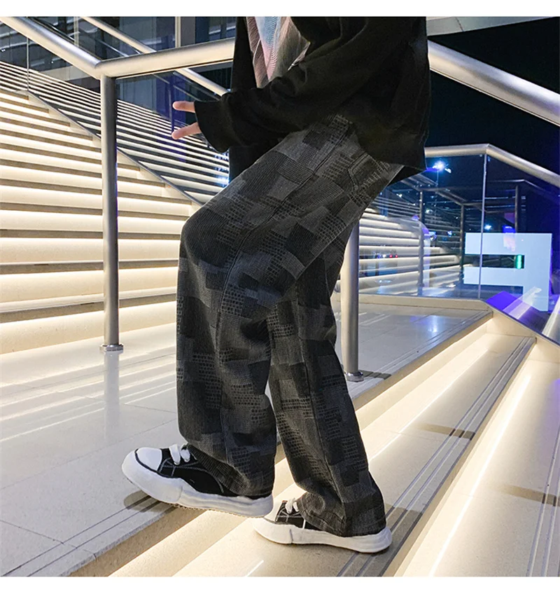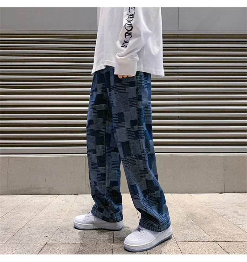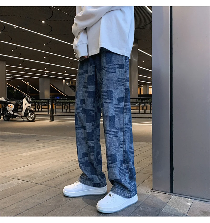 Autumn Blue Black Plaid Jeans For Men Y2K Vintage Wide-leg Jean High Street Loose Straight Denim Trousers Hip Hop Pantalones