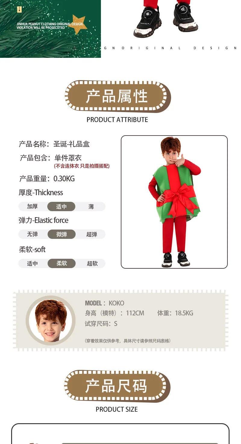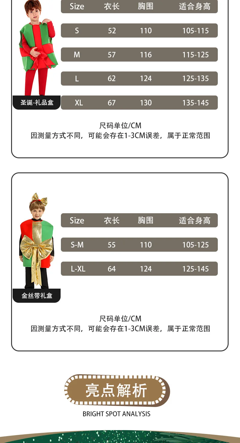 Bring the magic of the holiday season to life with our enchanting Children's Christmas Performance Costumes! Perfectly tailored for little ones aged 3 to 8, these costumes transform your child into Santa Claus or a delightful gift box, making them the star of every holiday party and performance. With a soft, comfortable fit, your child will feel festive and free to express their joy on stage or during family gatherings.