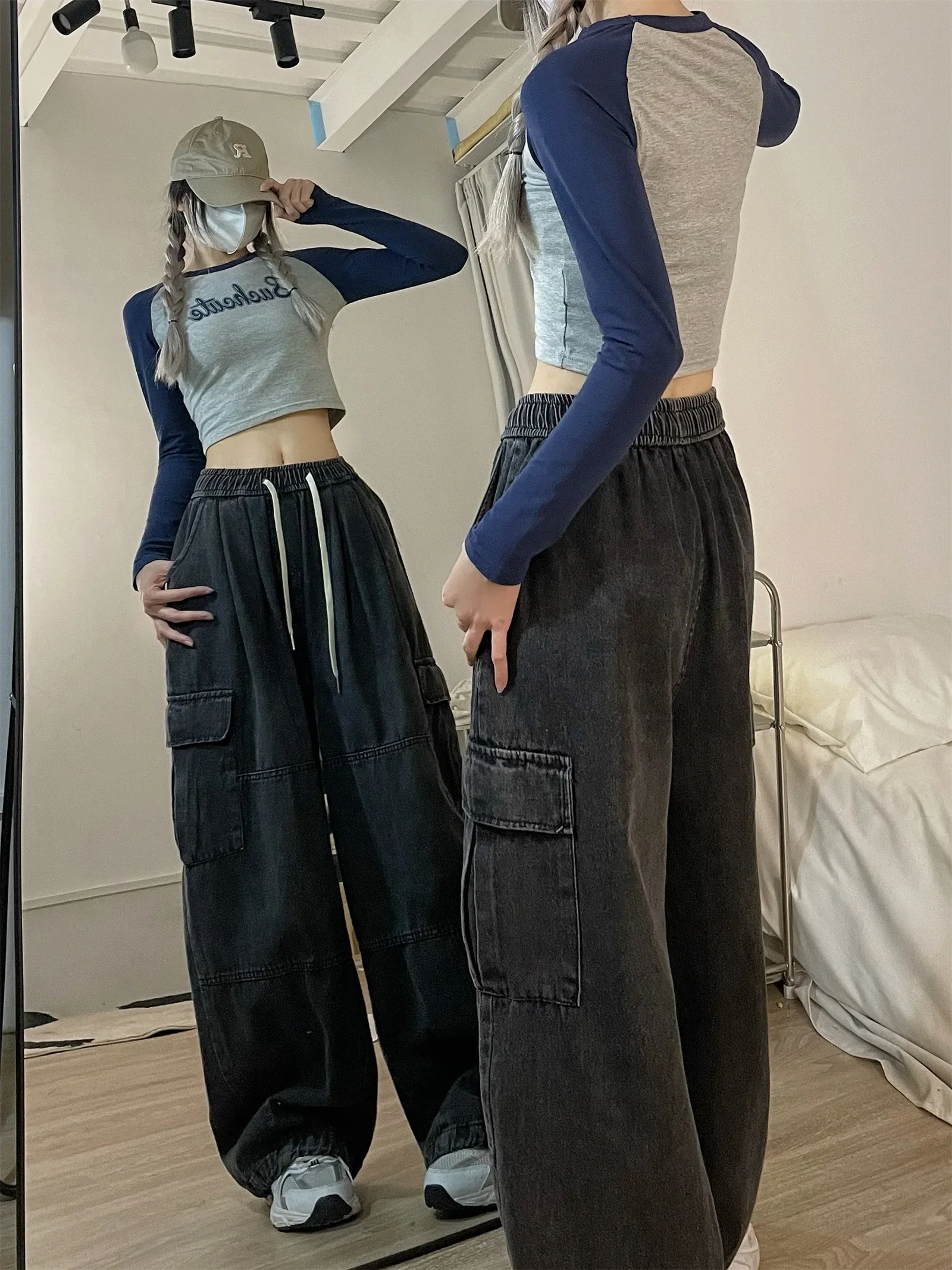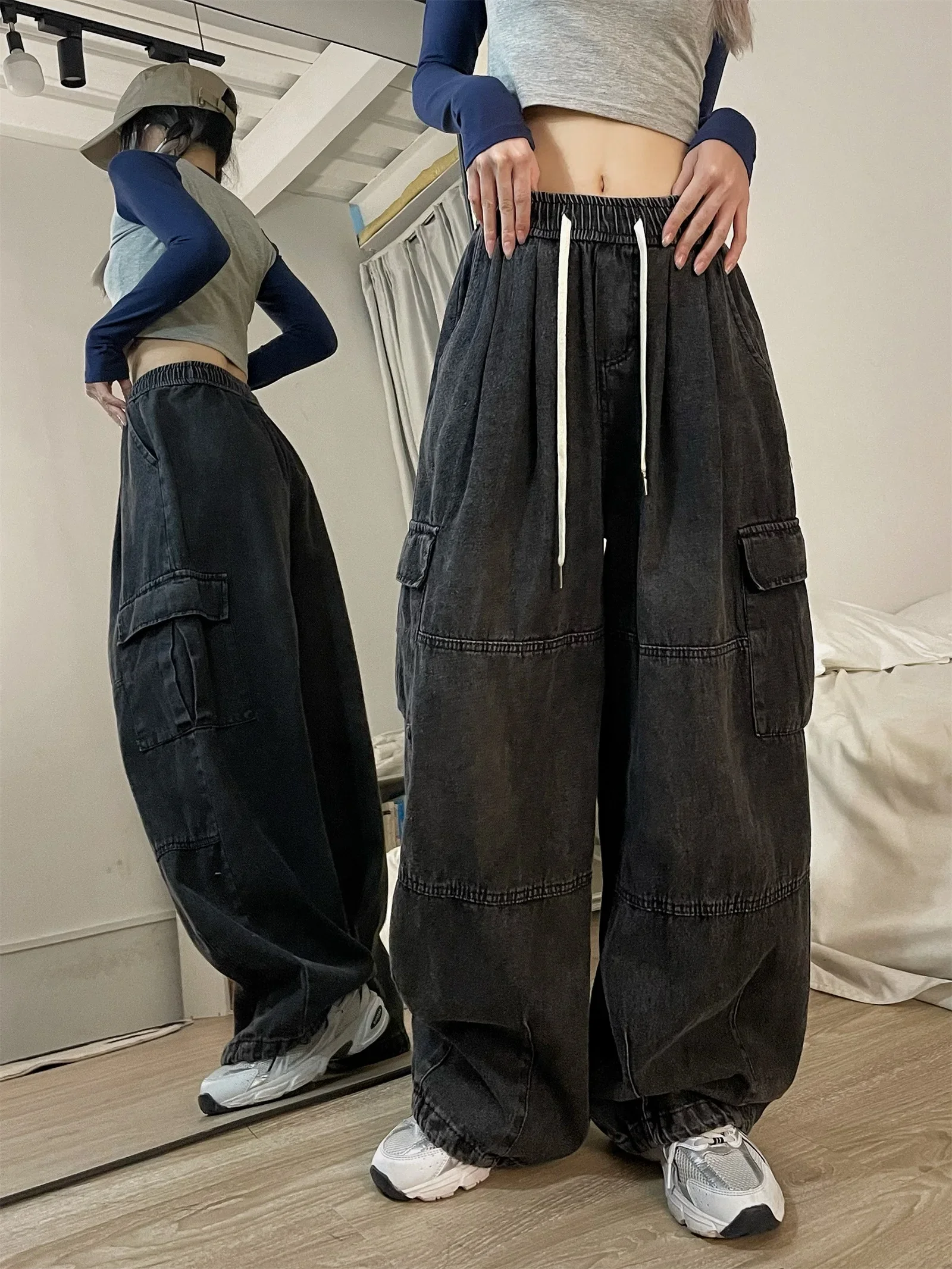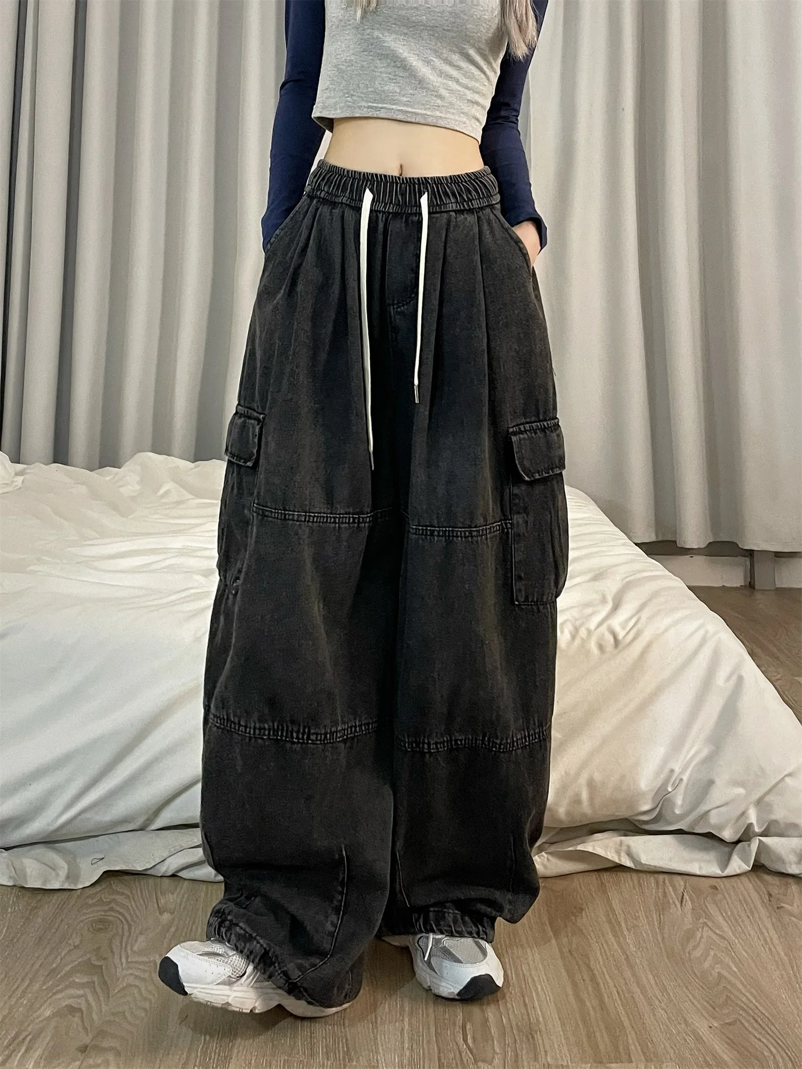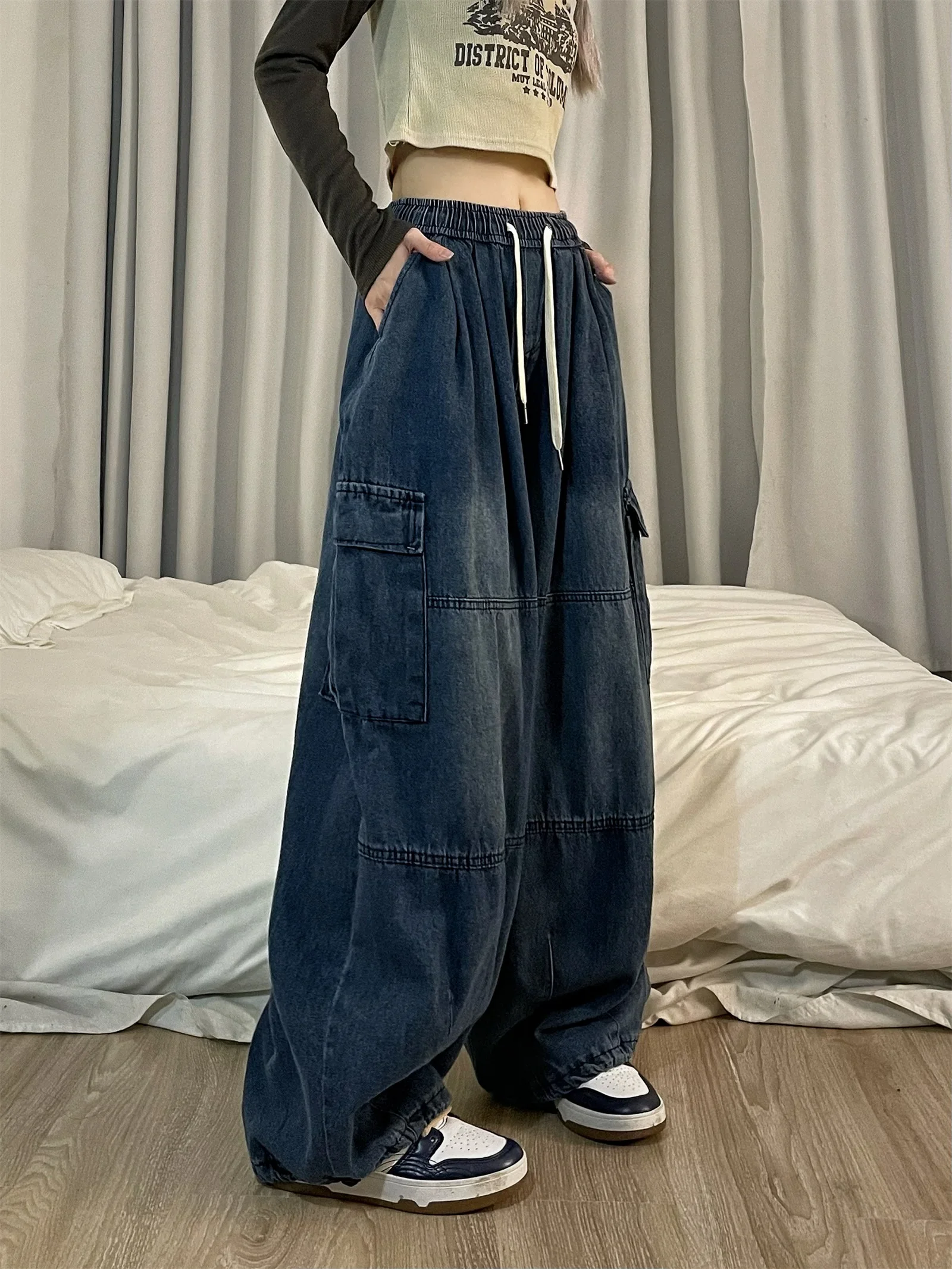 Vintage Blue Cargo Jeans Women Baggy Denim Pants Oversized Y2K Grunge Hip Hop Streetwear Harajuku Casual Wide Leg Trousers