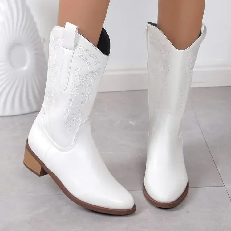 Women Fashion Zipper Knight Boots Ladies Autumn Thick Sole Chunky Heels Retro Boots Pointed Toe Shoes Embroidered Cowboy